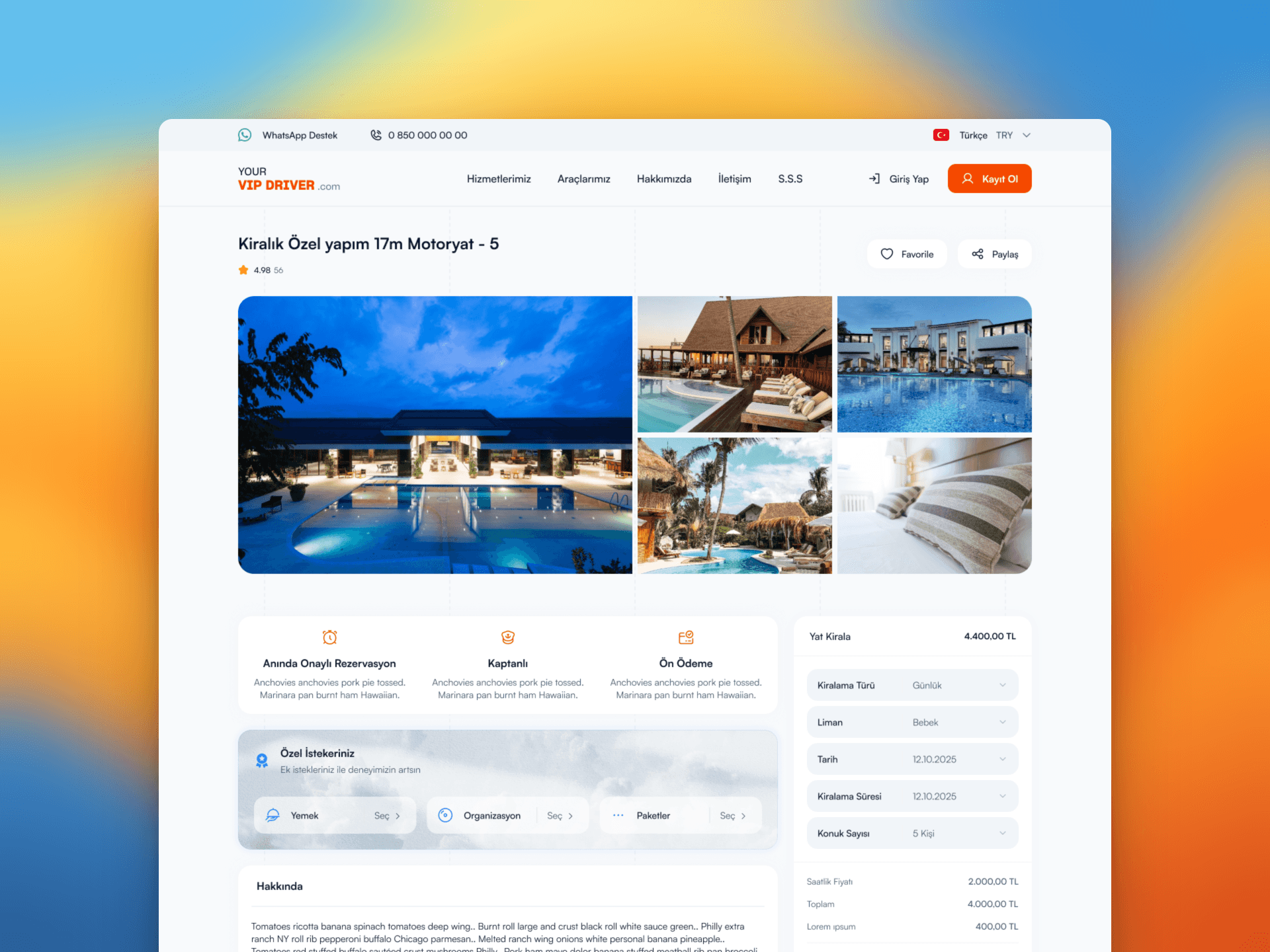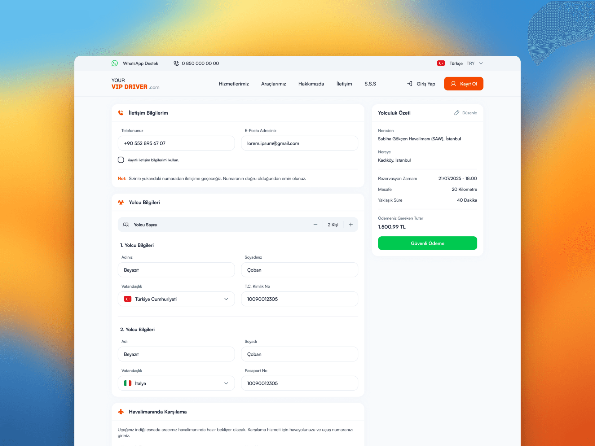 Müşterimizin en büyük beklentisi olan "kolay araç bulma ve seçme kurgusu", projenin merkezini oluşturdu. Havalimanı transferi gibi zaman duyarlılığı yüksek bir hizmette, kullanıcının transfer noktasını ve araç segmentini saniyeler içinde belirleyebilmesi kritik bir öneme sahipti. Bu doğrultuda, ana sayfada merkezi konumlandırılmış, sezgisel bir rezervasyon motoru tasarladım. Kullanıcı dostu bu modül; varış noktası, kişi sayısı ve bagaj kapasitesi gibi değişkenleri anlık olarak işleyerek, kullanıcıya en uygun VIP araç seçeneklerini şeffaf bir hiyerarşiyle sunuyor. Araç seçim ekranlarında ise yüksek çözünürlüklü görselleri, araç özelliklerini (konfor donanımları, kapasite vb.) ve fiyat bilgisini dengeli bir şekilde yerleştirerek kullanıcının karar verme sürecini maksimize ettim.